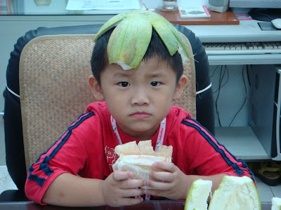 到此為止是僵硬但還是可愛的照片,接下來要他表演快樂的吃柚子,結果他給我以下的表情: